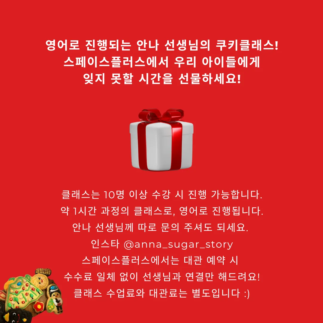 수업은 영어로 진행되며 만 4세 이상 친구들이라면 수업을 들을 수 있어요. 쿠키하우스, 컵케익 6구, 크리스마스리스, 제주 미니버전 만들기 중 선택하실 수 있답니다. 수업 시간은 약 1시간 정도 소요되며 준비 및 포토타임, 정리 시간 등을 고려하여 대관은 3시간 이상 예약해주세요 :)