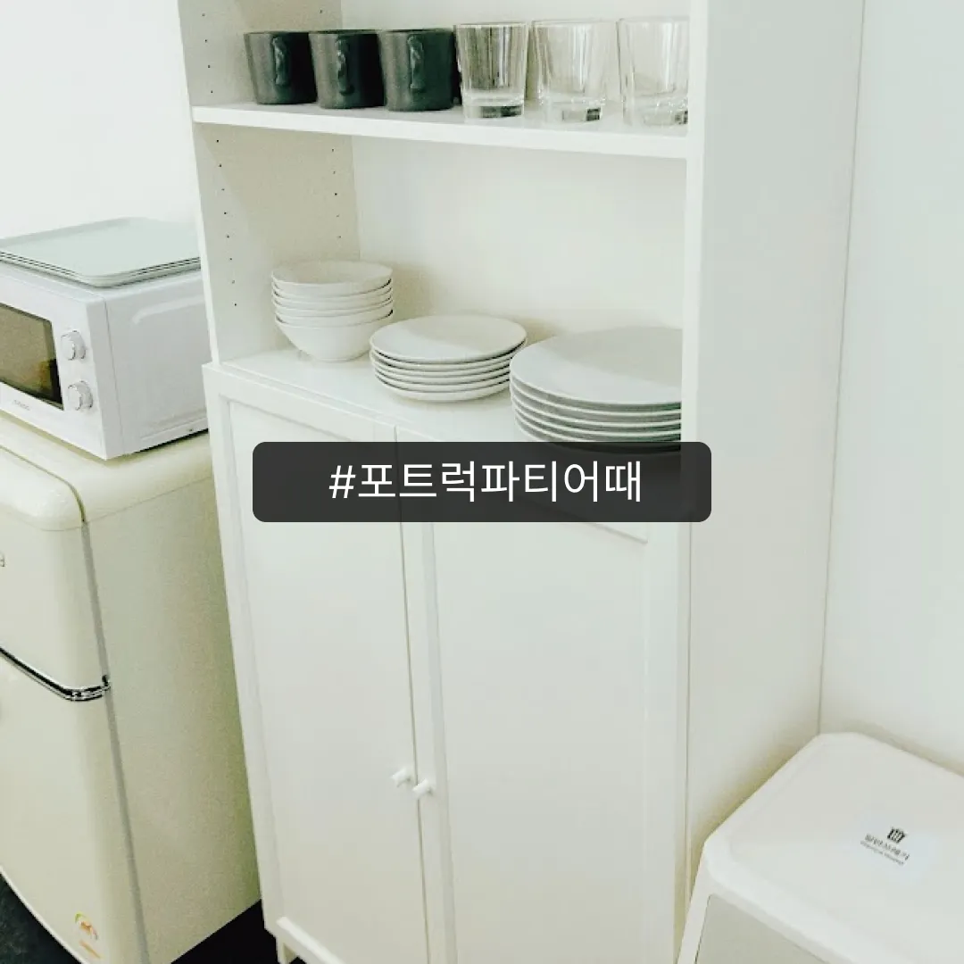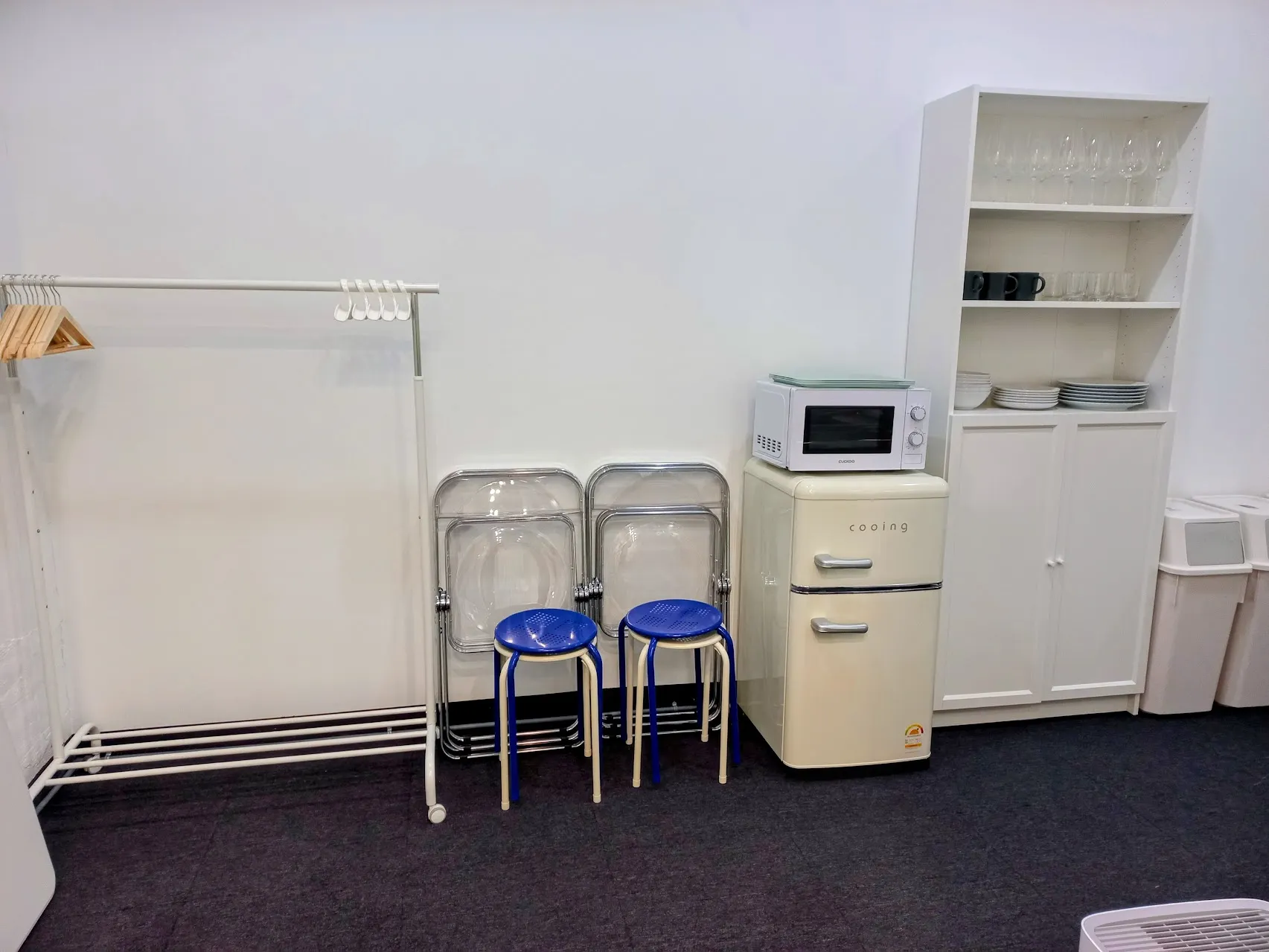 가벽으로 분리된 공간에 싱크대 / 냉장고 / 전자레인지 / 전기포트 / 네스프레소 캡슐커피머신/ 접시, 컵(와인잔, 머그) / 도마와 과도/ 식기류 등의 주방용품이 준비되어 있습니다.