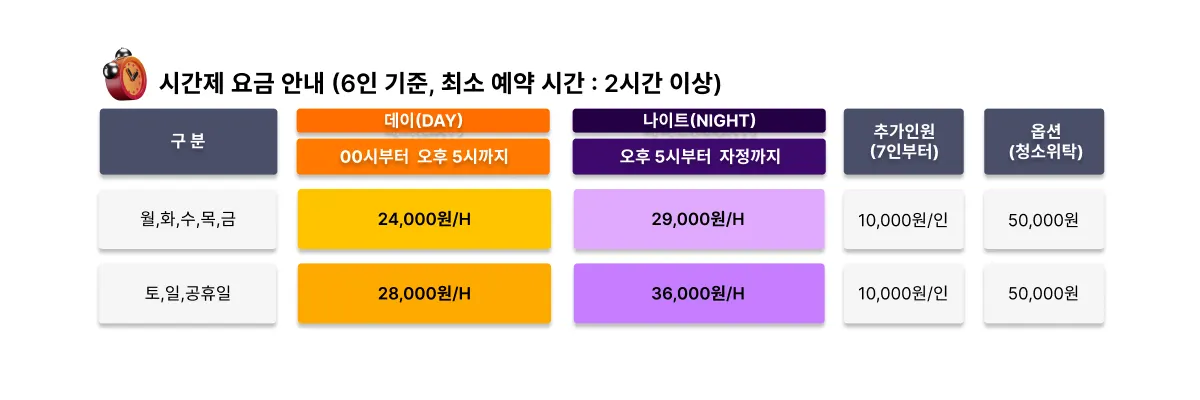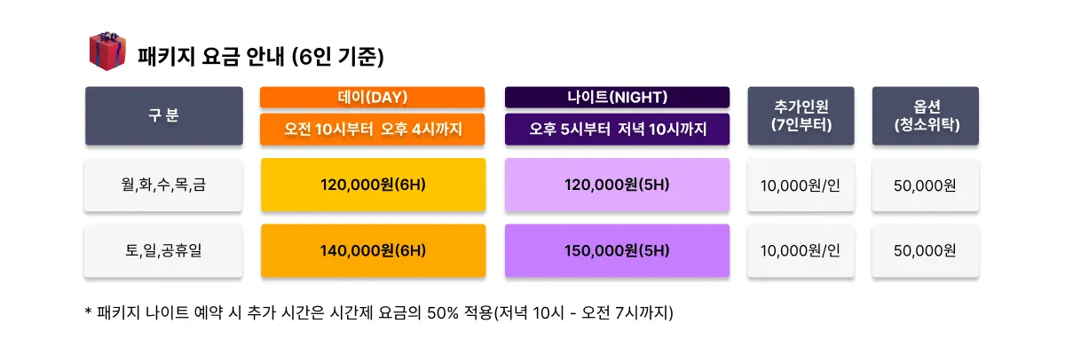 기준 인원은 6인이며 추가 인원당 1만원이 추가됩니다(최대20인)